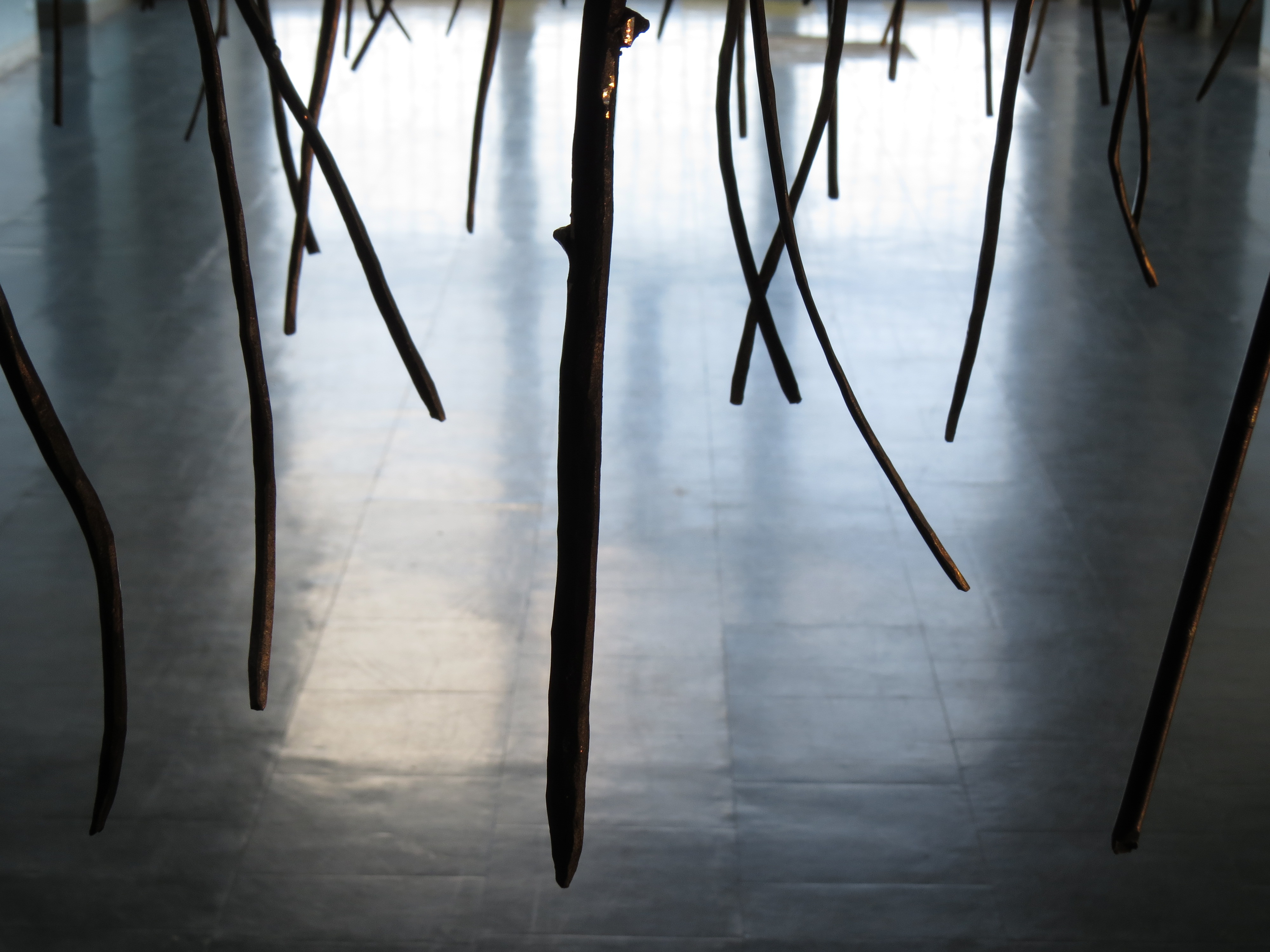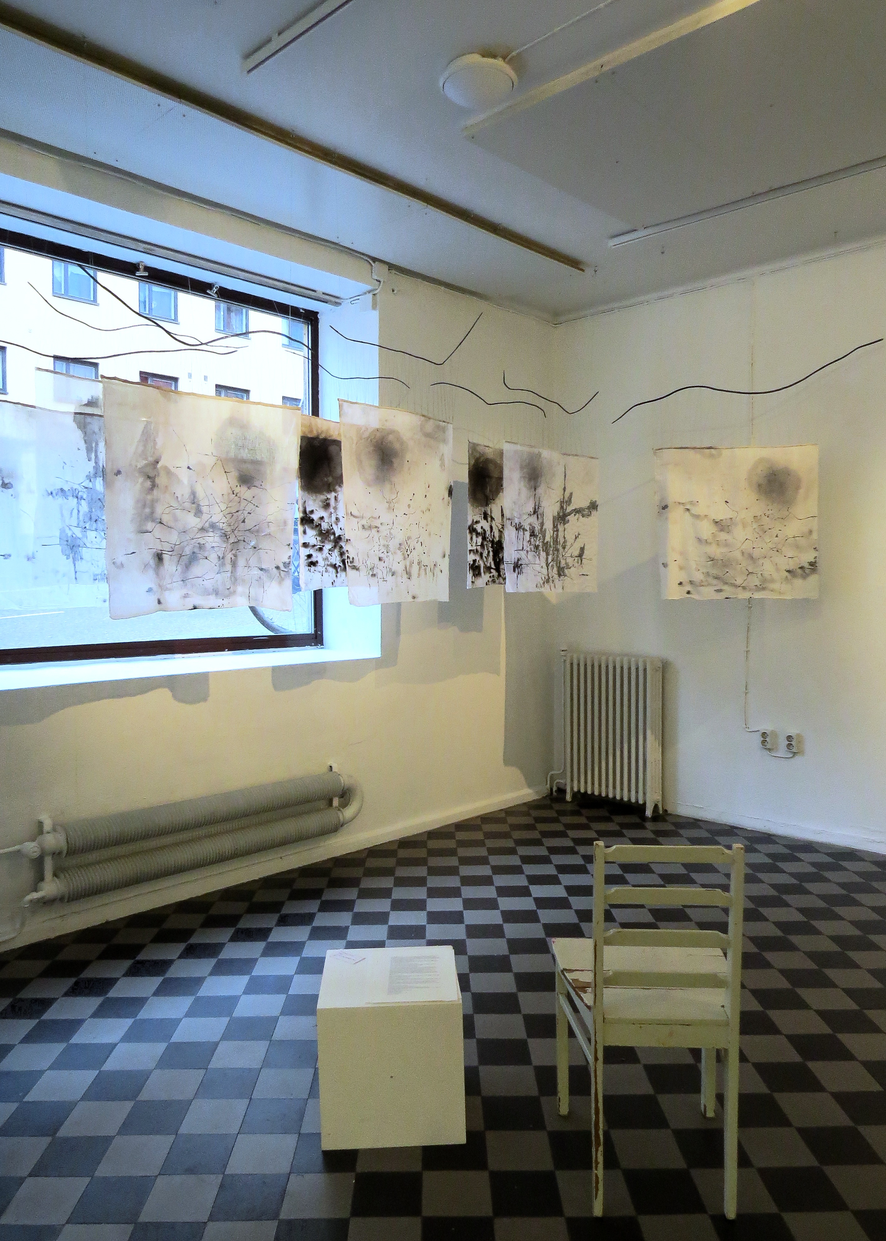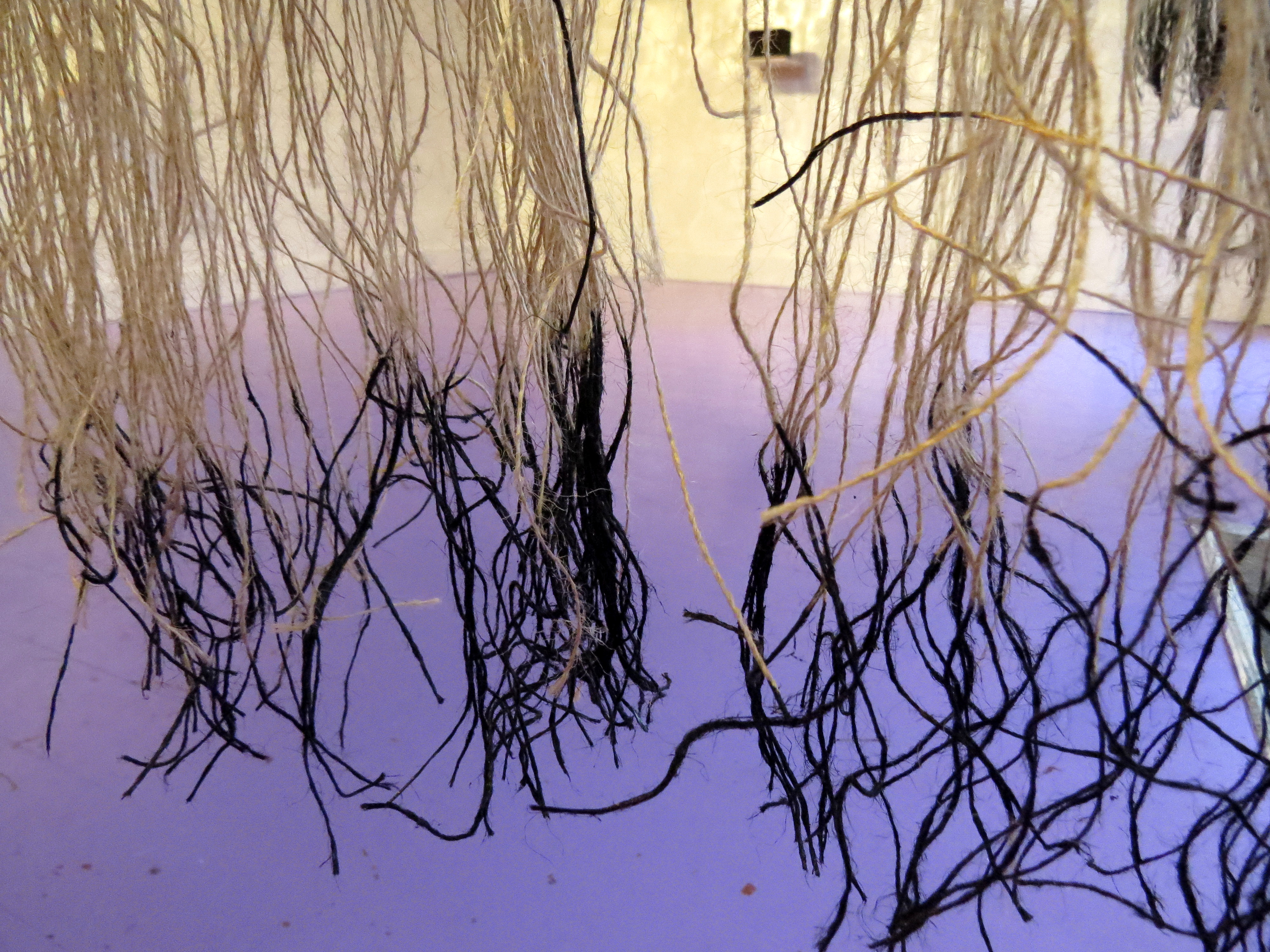 installaatiot, muste, savi ja tuhkamaalaus kierrätetyille pellava ja juuttilangoille