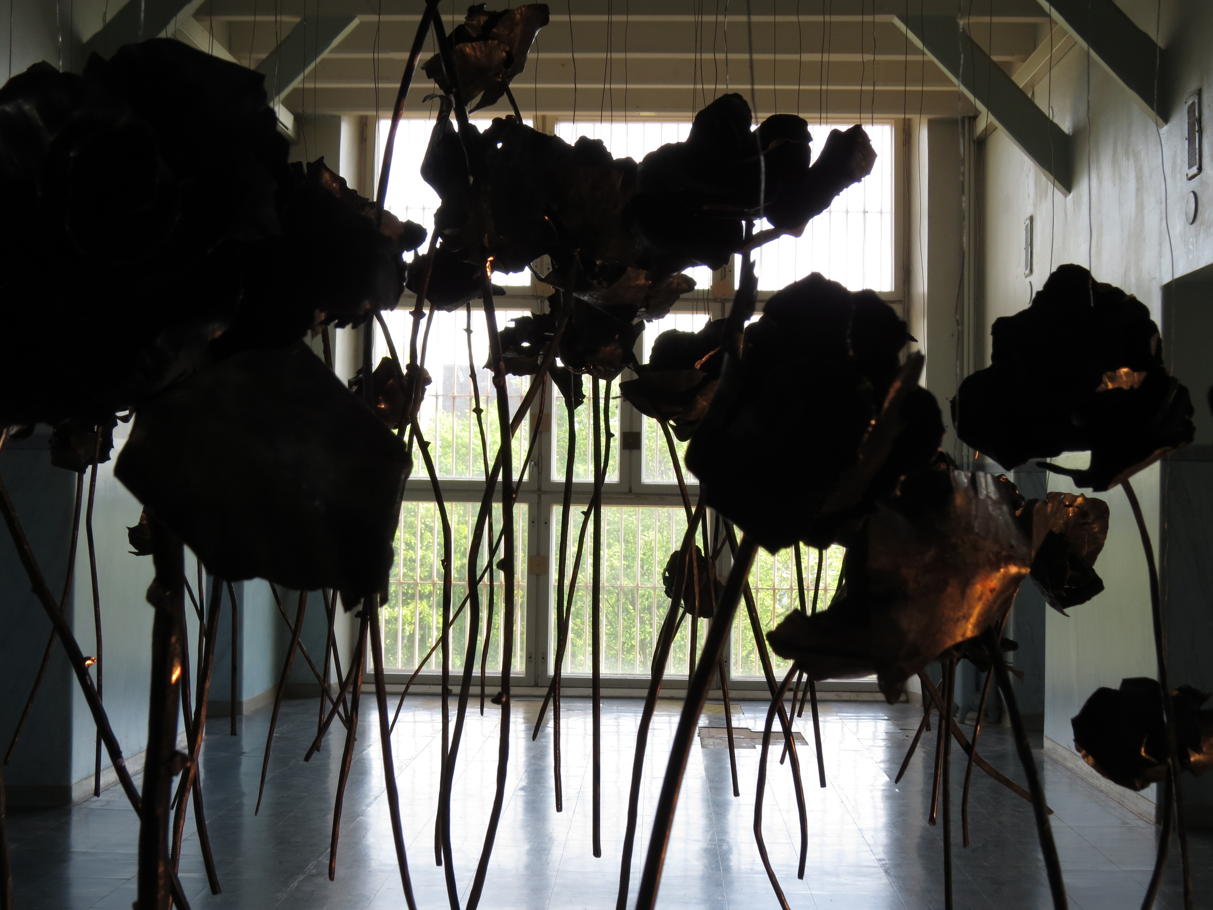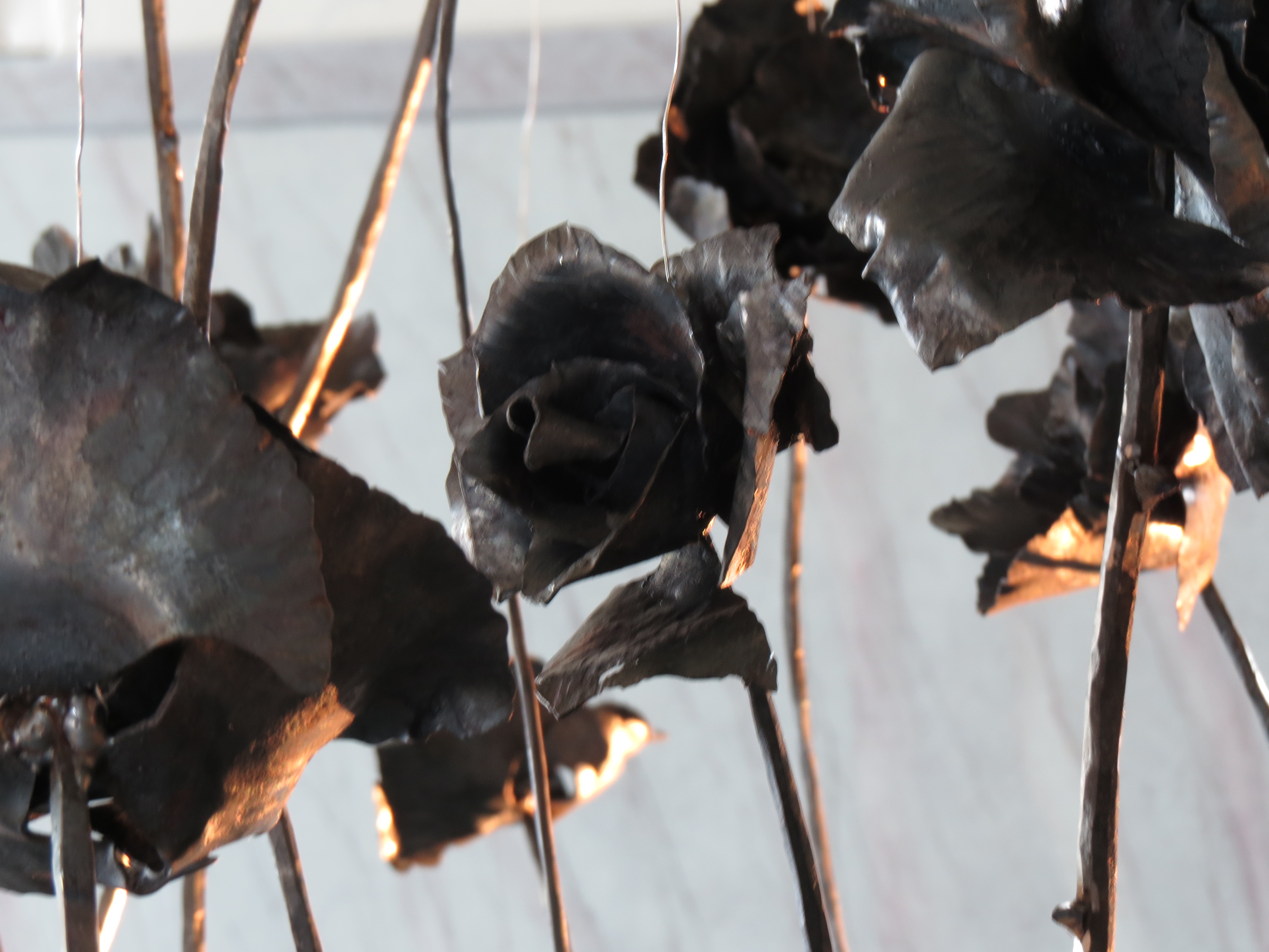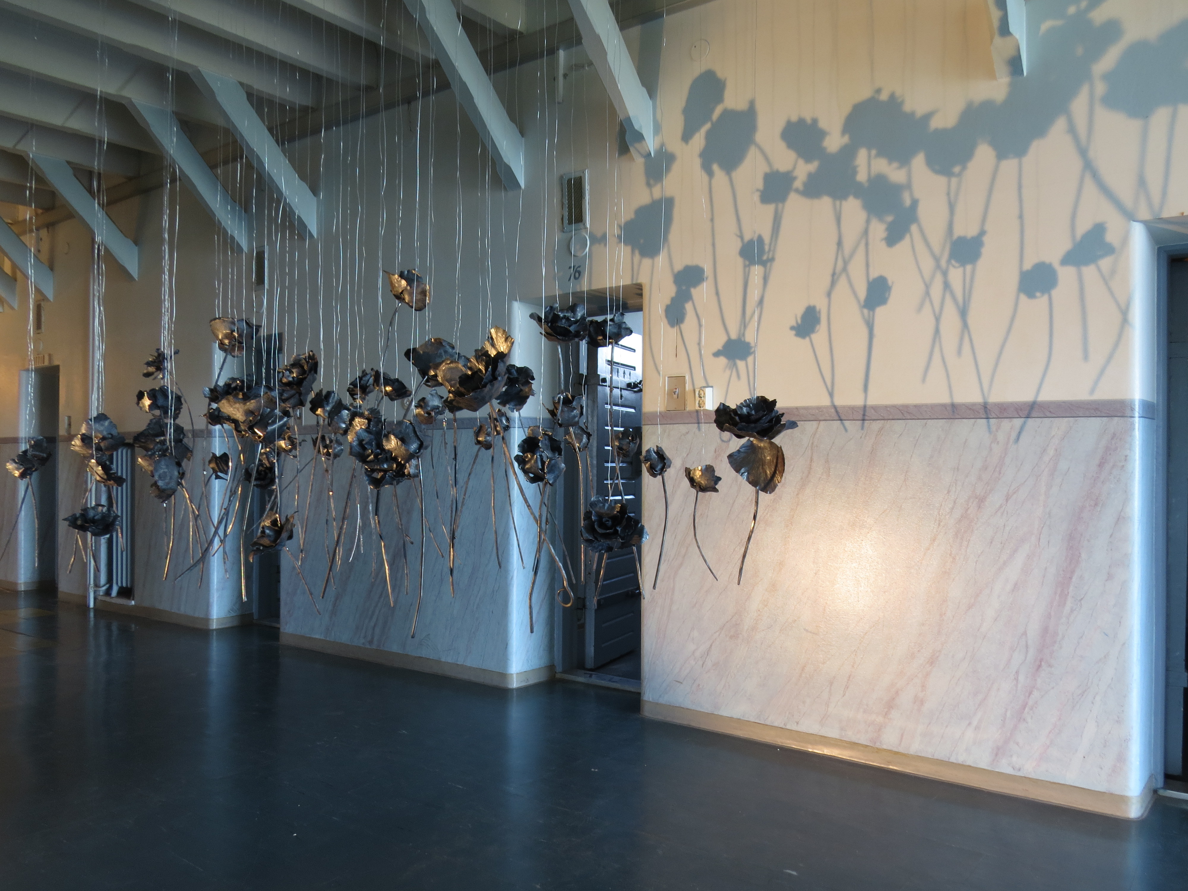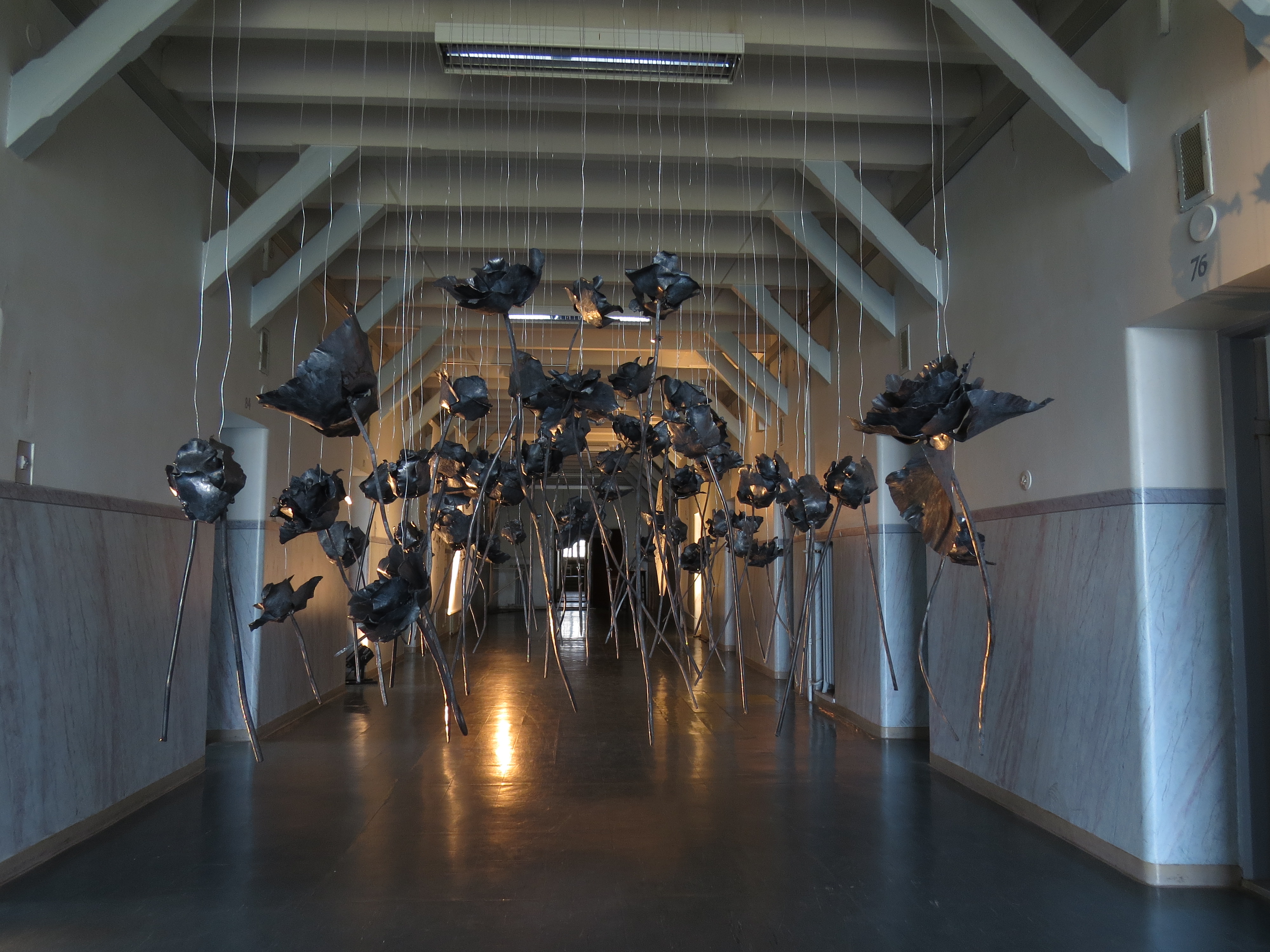 installaatiot, muste, savi ja tuhkamaalaus kierrätetyille pellava ja juuttilangoille